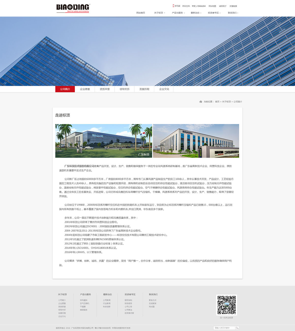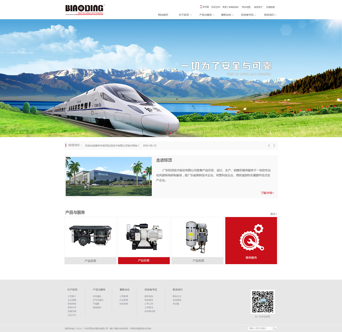 廣東標頂技術股份有限公司是集產品開發、設計、生產、銷售和維保服務于一體的專業化風源系統研制基地,是廣東省高新技術企業、民營科技企業、原鐵道部機車重要件定點生產企業。