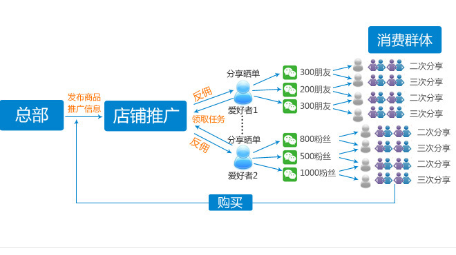 分銷平臺消費者即代理者,并且通過技術支持使平臺能夠實現(xiàn)統(tǒng)一的管理。可以把客戶、好友和粉絲快速轉化為分銷商,一店變多店,引爆社交關系鏈。